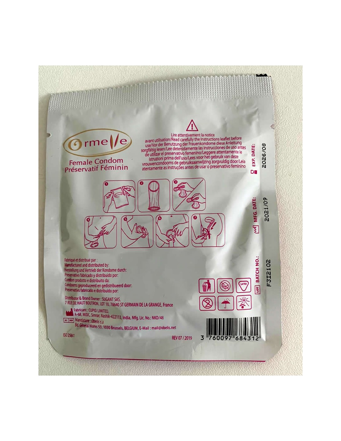 Every female condom is 100% electronically tested to ensure maximum safety ORMELLE female condom enhances the pleasure of love making, while providing protections from unintended pregnancies and sexually transmitted infections.